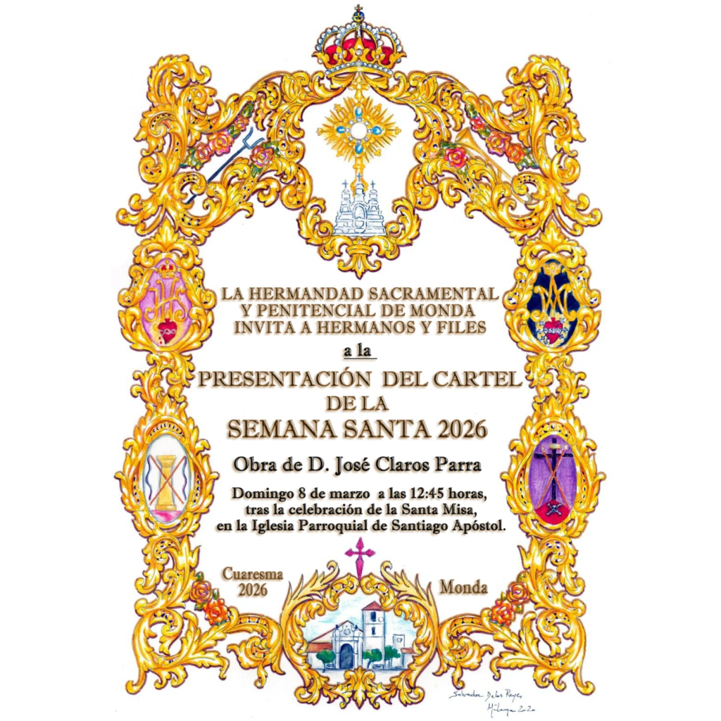 La Hermandad Sacramental y Penitencial de Monda, tiene el honor de invitar a Hermanos y Fieles a la Presntación del Cartel de la Semana Santa 2026, obra de D. José Claros Parra.
